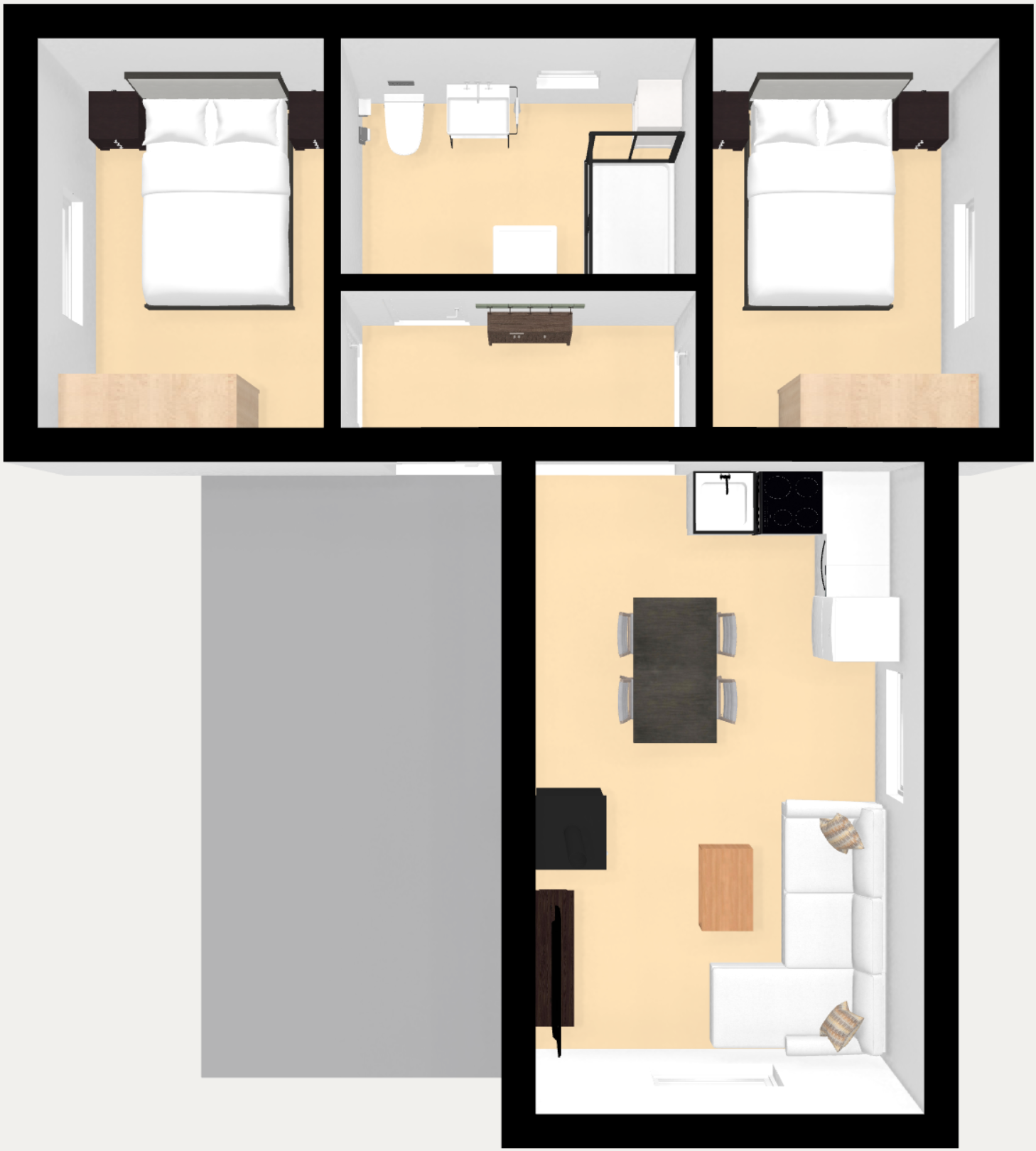 - Opcija Terasa: Natkrivena terasa (kao na vizualizaciji) nije uključena u cijenu kvadrata stambenog prostora. Moguća je izvedba uz nadoplatu.