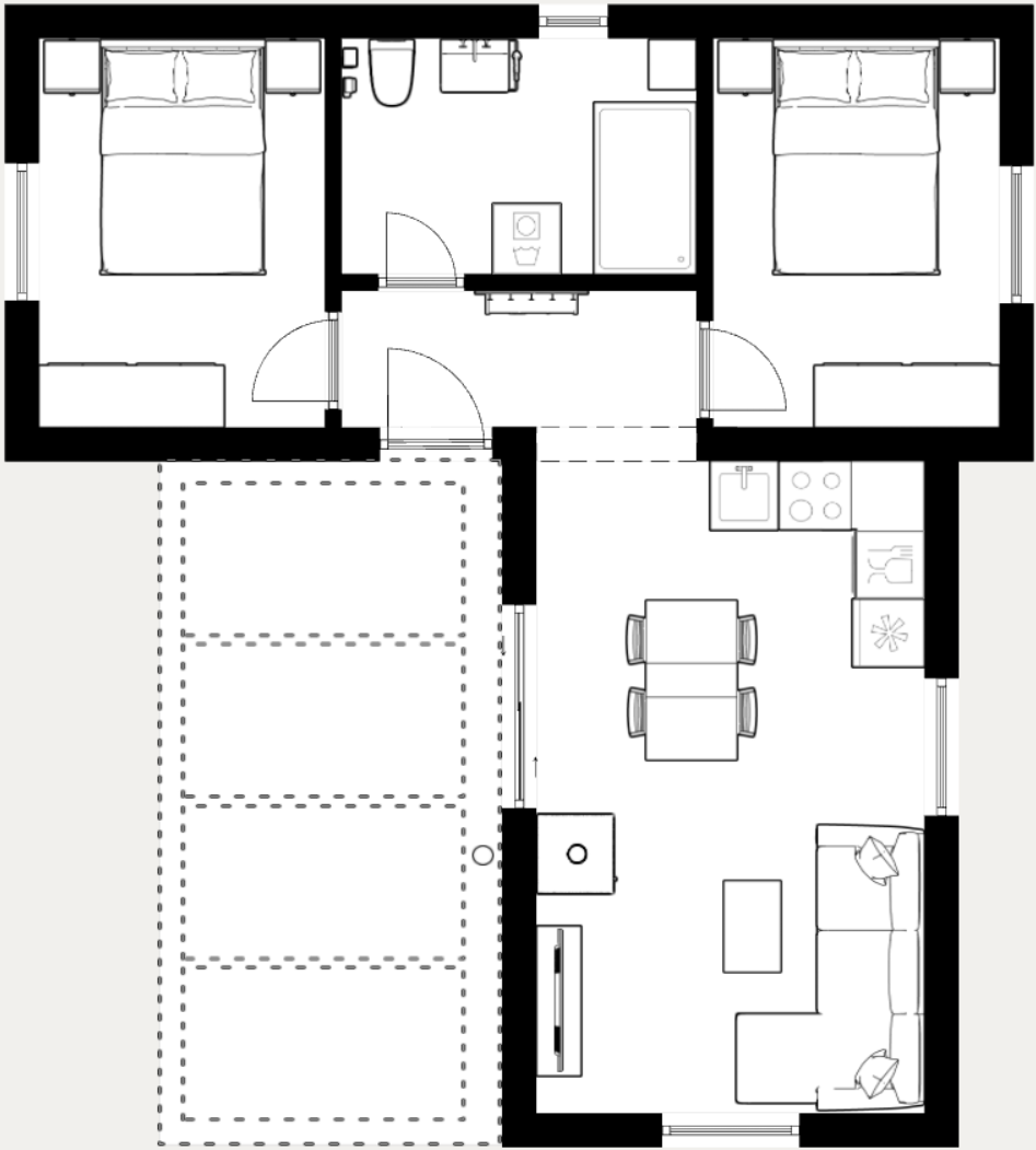 Model Linea V2 predstavlja iskorak prema modernom mediteranskom stilu, karakterističan po svojim razigranim krovnim plohama koje kući daju dinamičan i prepoznatljiv izgled. Njezin tlocrt od 60m2 u obliku slova L nije samo estetski privlačan, već iznimno funkcionalan jer jasno odvaja "dnevnu" od "noćne" zone, pružajući mir i privatnost unutar istog objekta. ​Jedno krilo kuće posvećeno je odmoru s dvije prostrane spavaće sobe i kupaonicom, dok je drugo osmišljeno kao svijetao open-space boravak povezan s kuhinjom. Ključna prednost ovog L-oblika je što sama kuća svojim zidovima prirodno formira i štiti vanjski prostor – stvarajući savršeno "dvorište" u koje se izlazi direktno iz dnevnog boravka. Taj prostor ostavljamo vama na izbor – idealan je za popločanu terasu ili pergolu po vašoj želji. Uz vrhunsku STIROTON izolaciju i kvalitetnu stolariju, Linea je dom stvoren za one koji vole moderni dizajn s potpisom kvalitete.