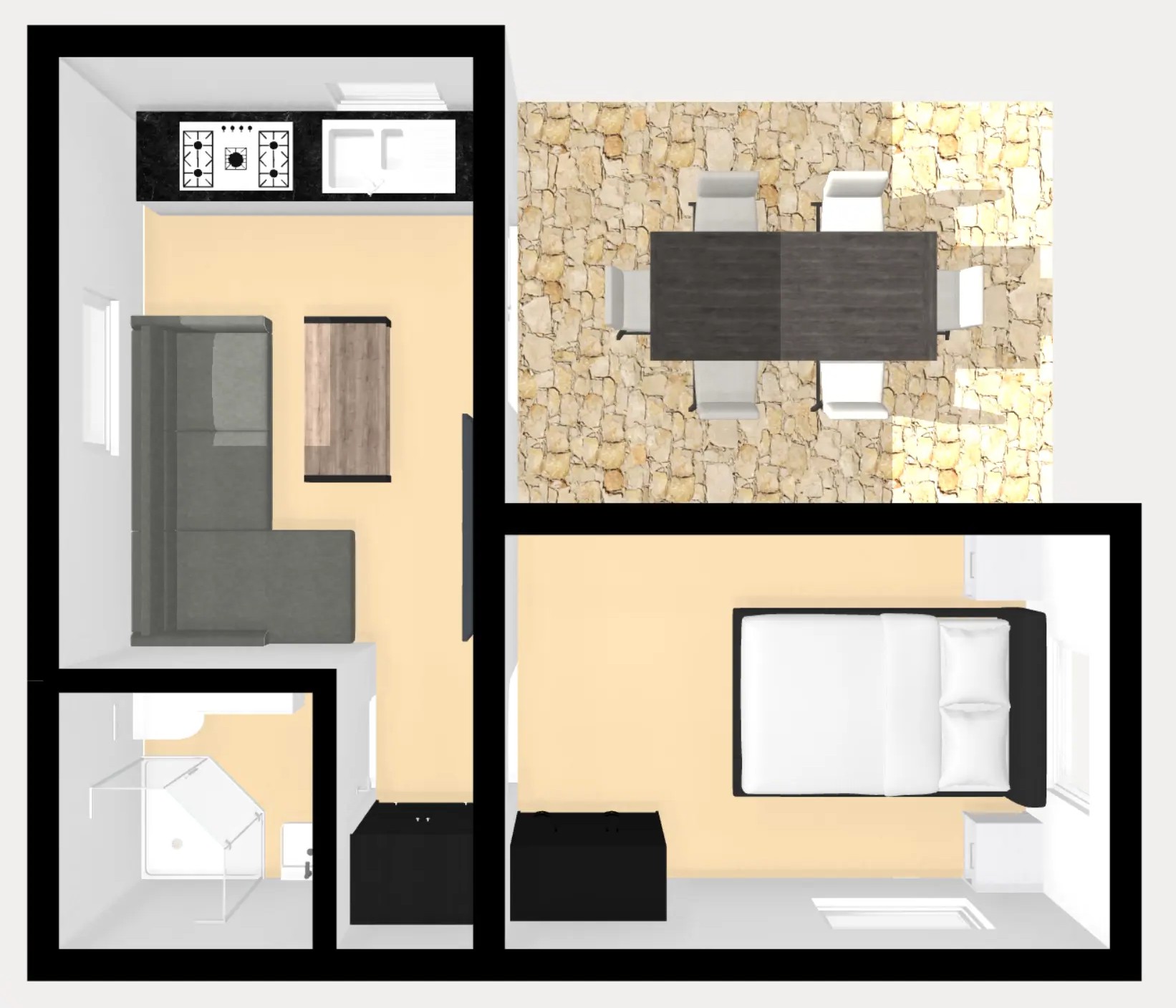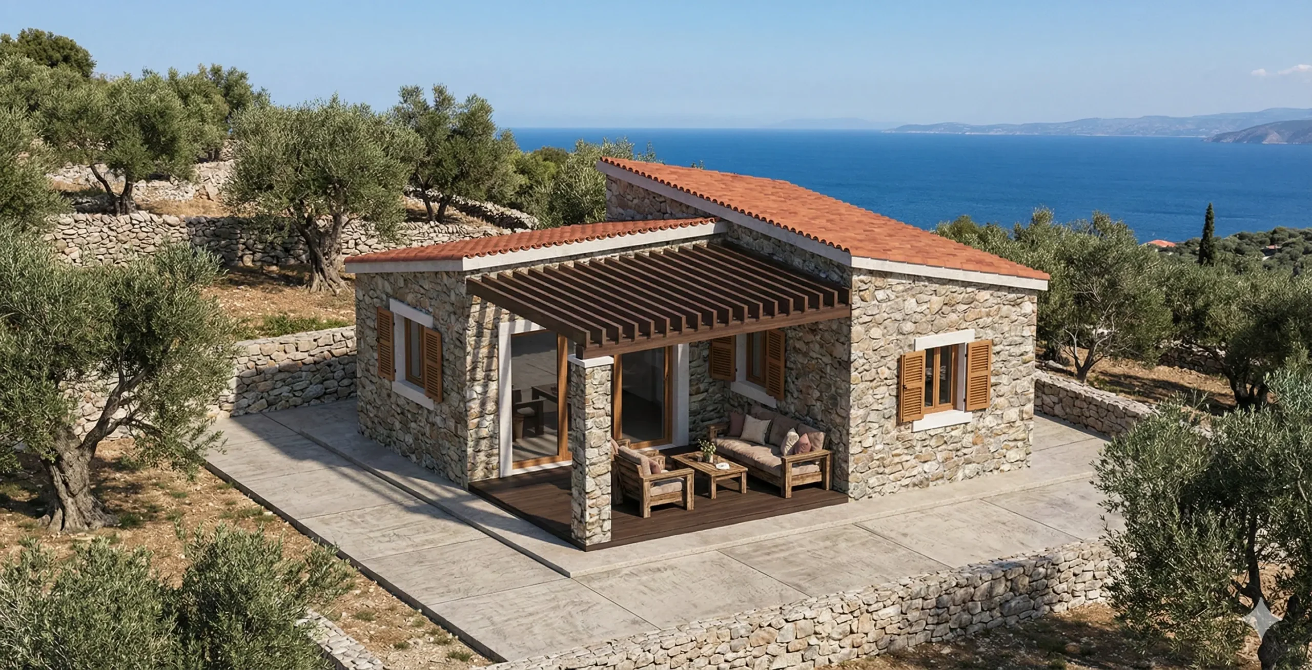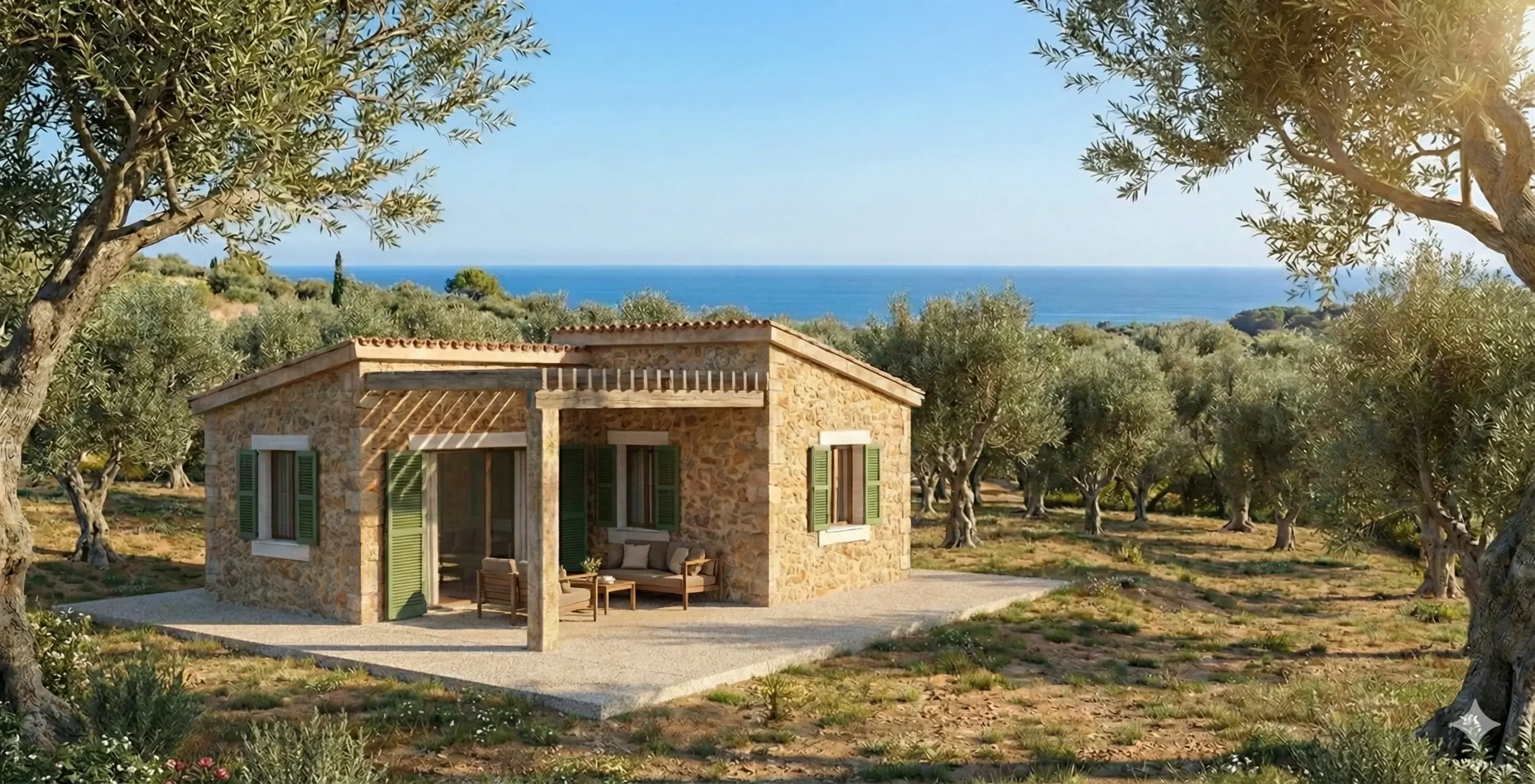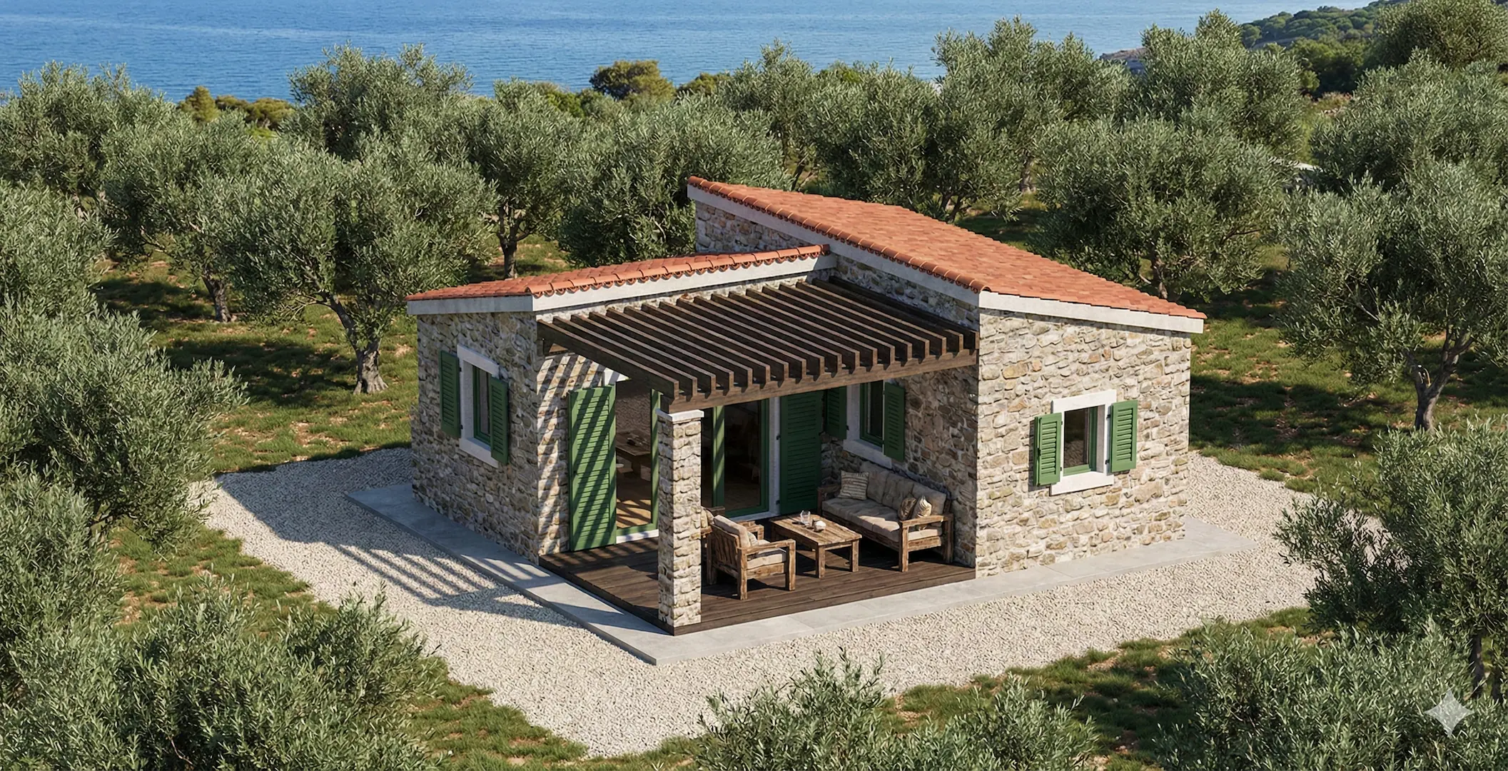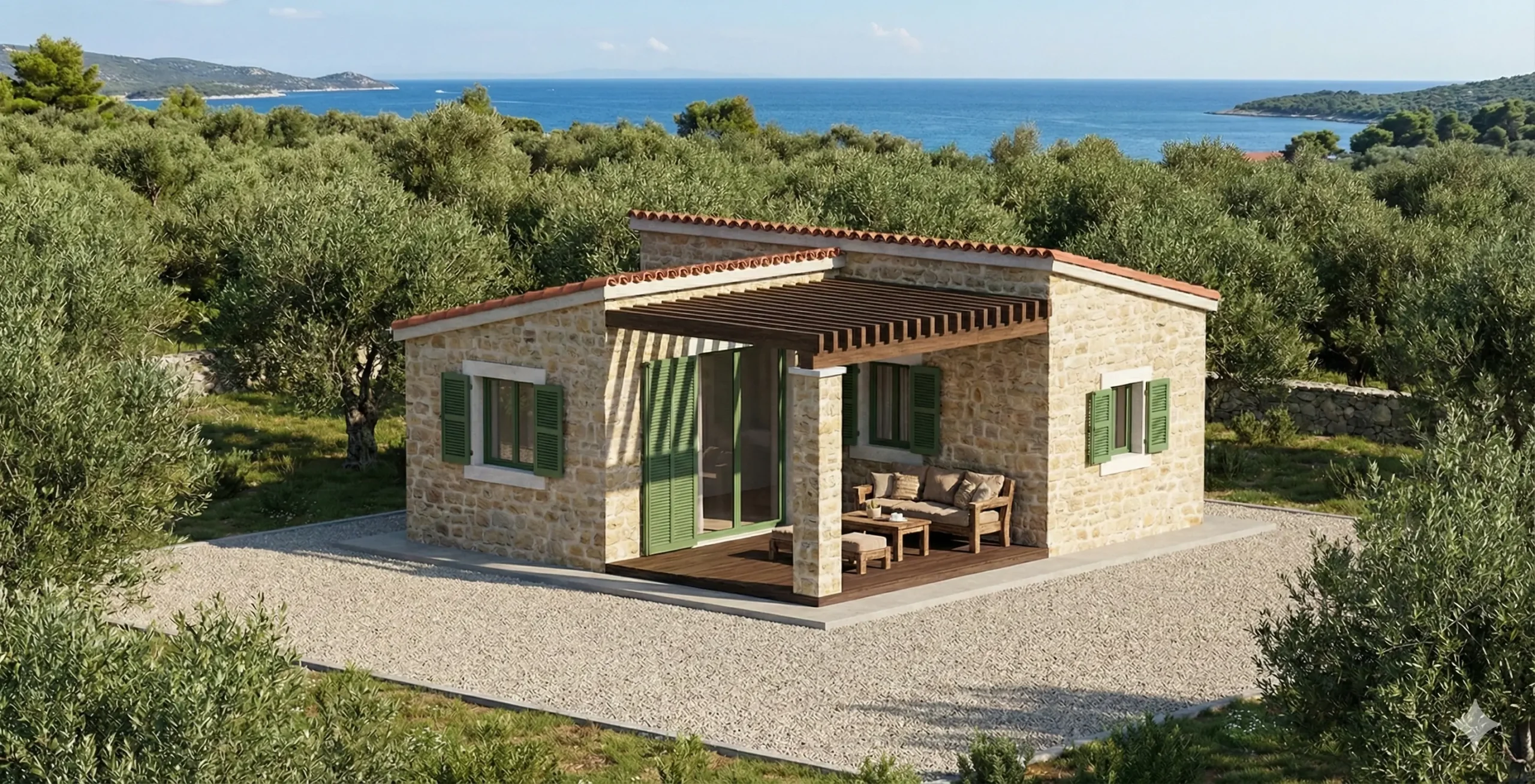 Model Maris donosi mir dalmatinskog zaleđa na vašu parcelu. Karakterizira ga L-tlocrt koji prirodno stvara zaštićeni kut za prostranu drvenu pergolu, čineći terasu srcem vašeg ljetnog boravka. Poseban šarm daju mu tradicionalne zelene škure koje, u kombinaciji s našom interpretacijom starog kamena, pružaju autentičan osjećaj stoljetne gradnje uz vrhunsku izolaciju modernog doba. Idealna je kao vikendica za parove ili luksuzni apartman za goste koji traže mir u masliniku.