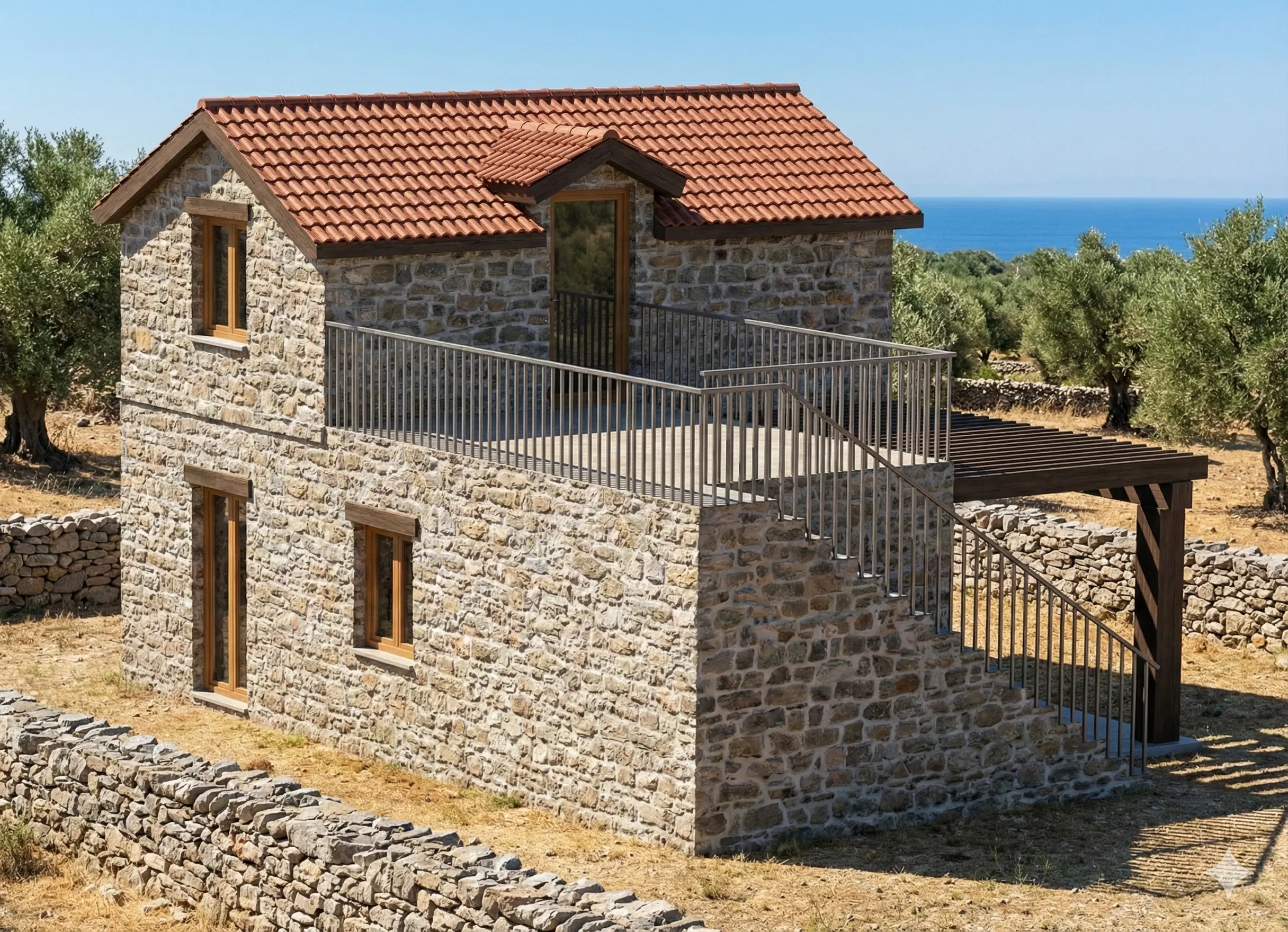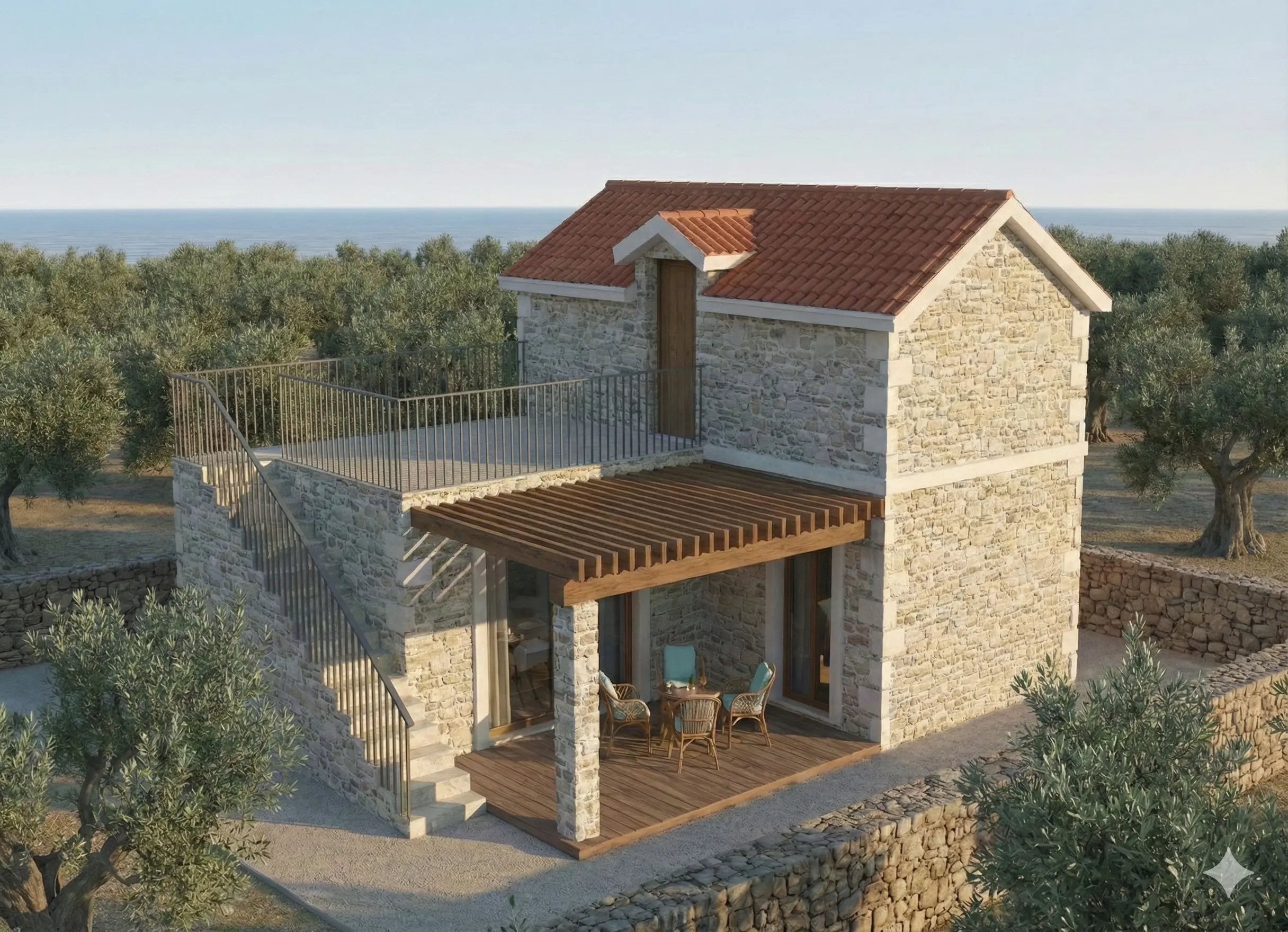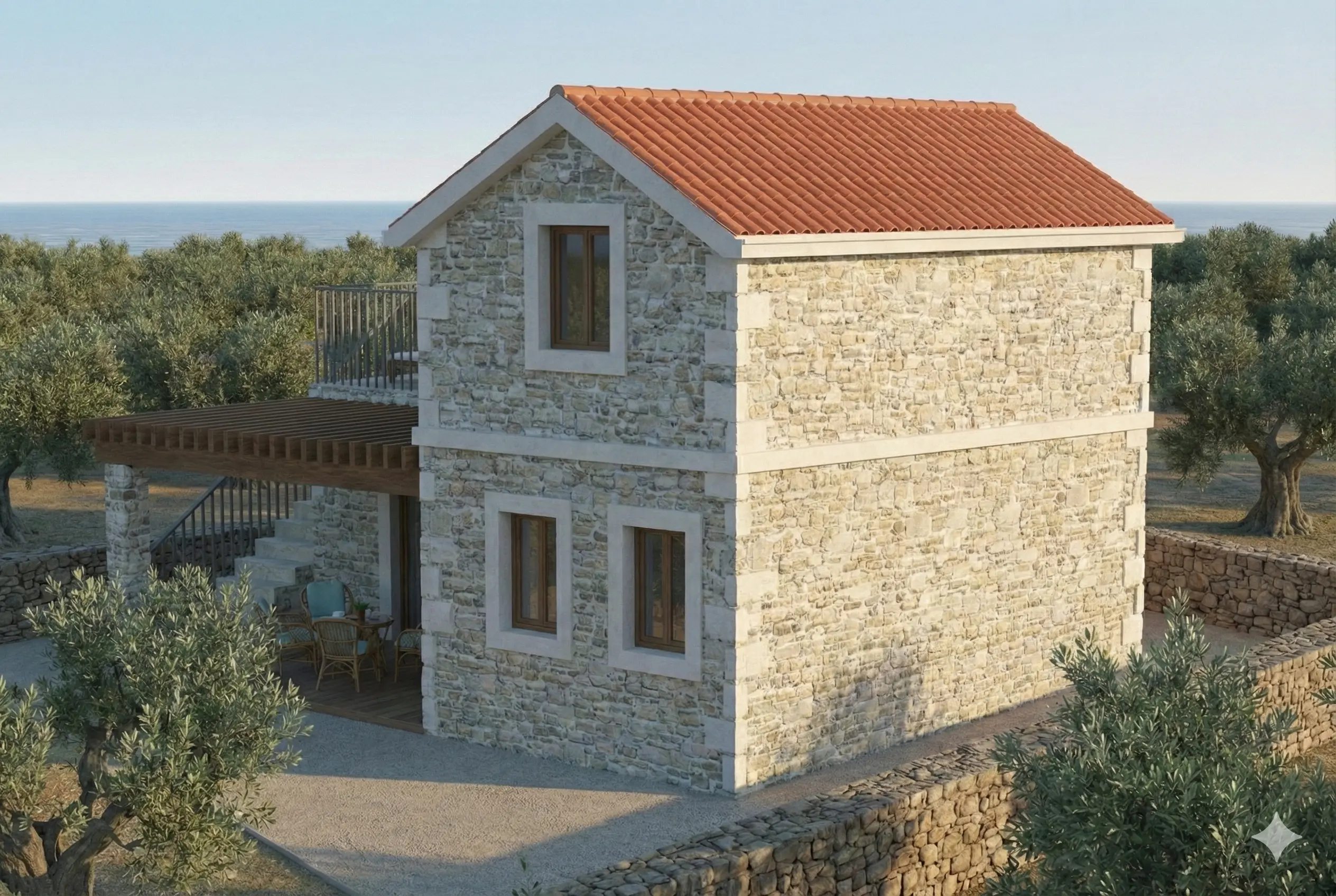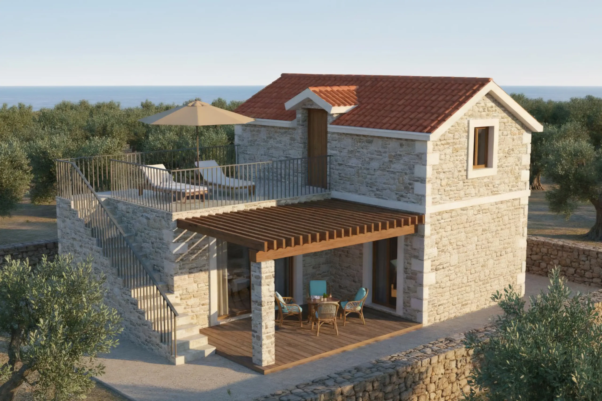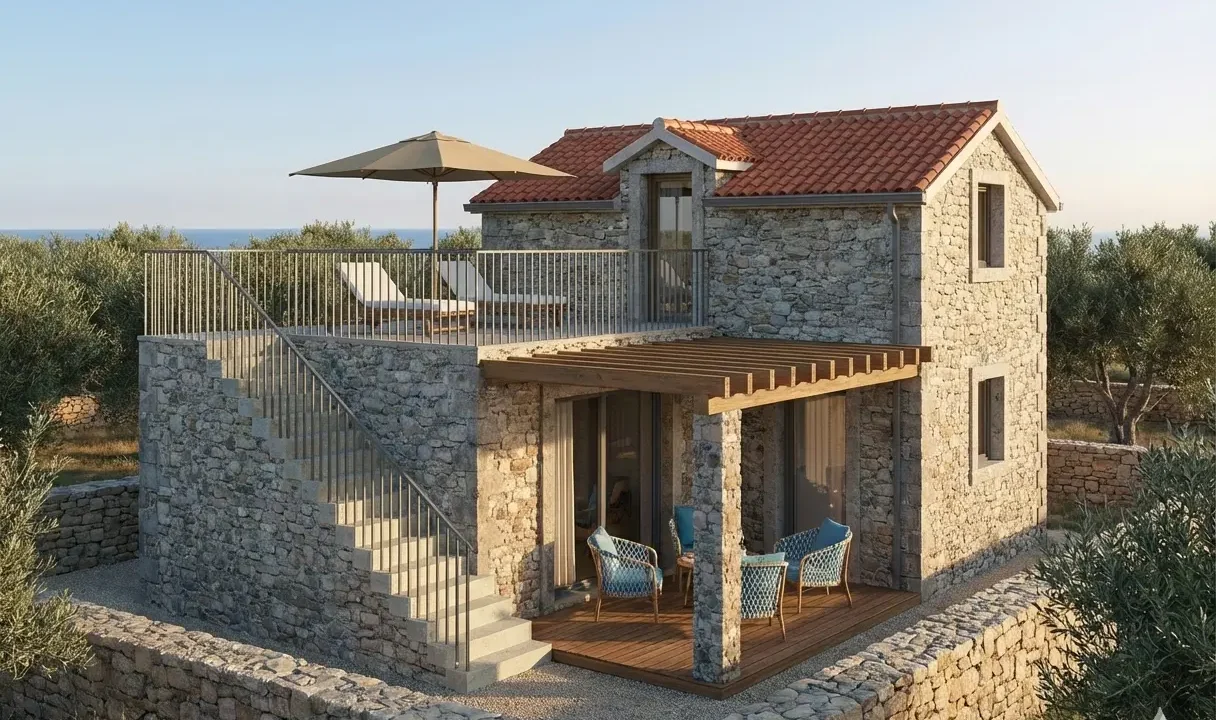 Model Solis redefinira pojam moderne mediteranske vile, pružajući raskošan prostor na dvije pažljivo planirane etaže. Prizemlje je osmišljeno kao prostrana zona za život s otvorenom kuhinjom, dnevnim boravkom i jednom spavaćom sobom, dok gornja etaža skriva još dvije komforne sobe za potpunu privatnost obitelji ili gostiju. Kruna ovog modela je velika panoramska terasa na katu – savršeno mjesto za sunčanje i uživanje u pogledu koji seže preko vrhova maslina sve do mora. Autentična kamena tekstura i kosi krov u savršenom su suživotu s našom STIROTON tehnologijom, koja osigurava A+ energetski standard i vrhunsku izolaciju u objektu koji zrači tradicijom i luksuzom.